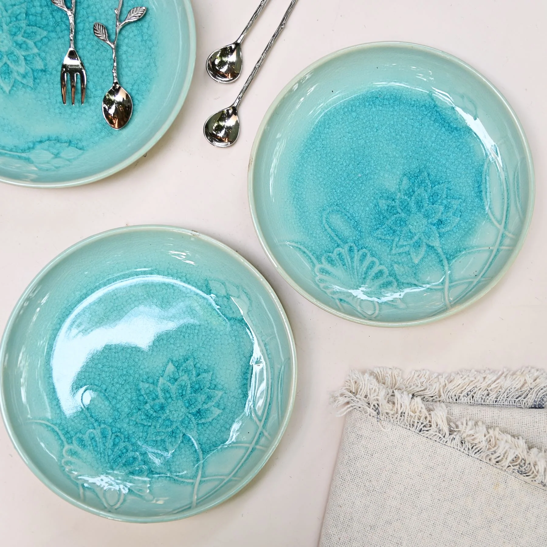 • Beautiful turquoise small plates: Perfect for snacks and tea times our beautiful Lotus Plates are great for serving and eating from. Made of high grade ceramic with a lovely colour, this will add charm to your place settings